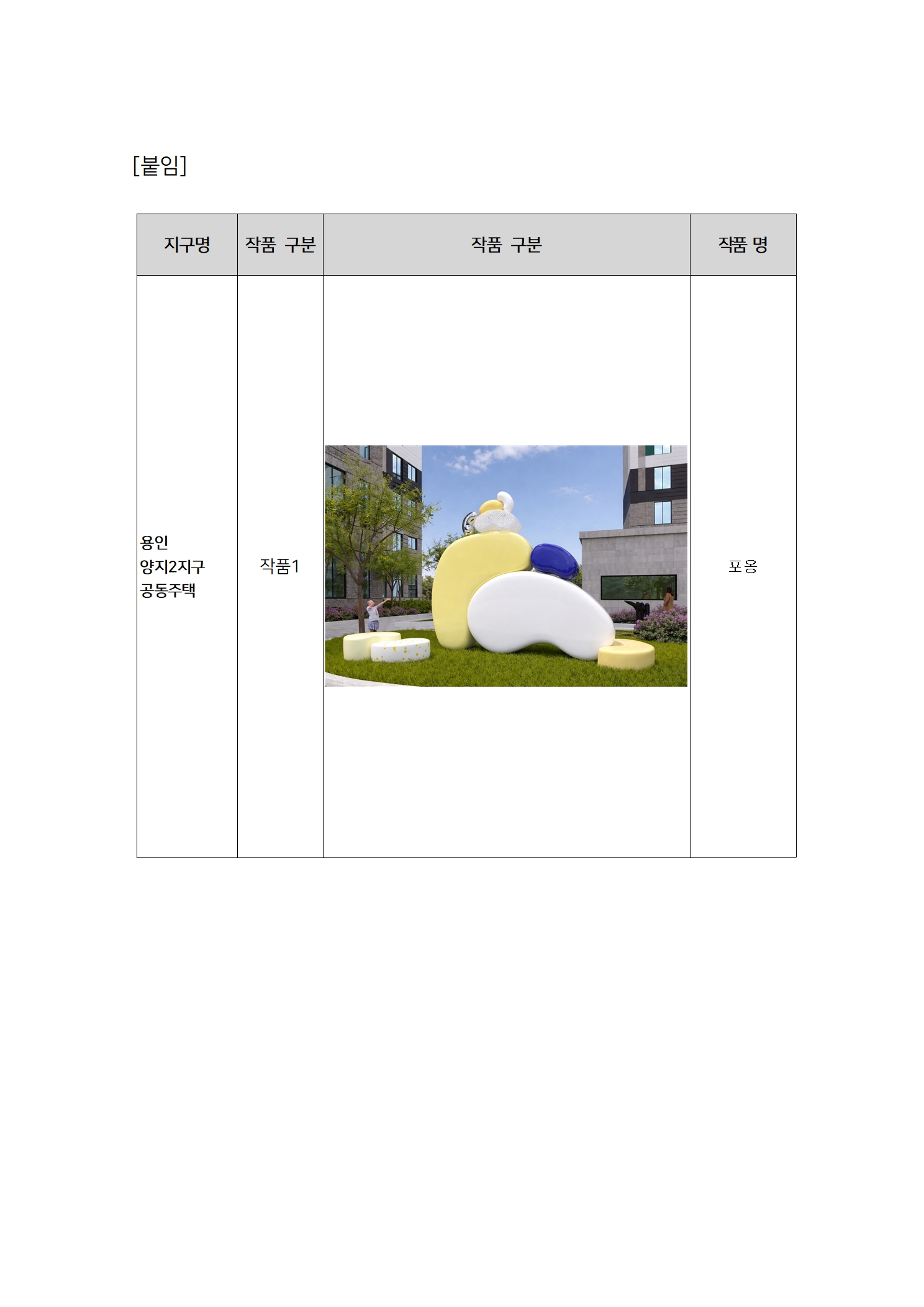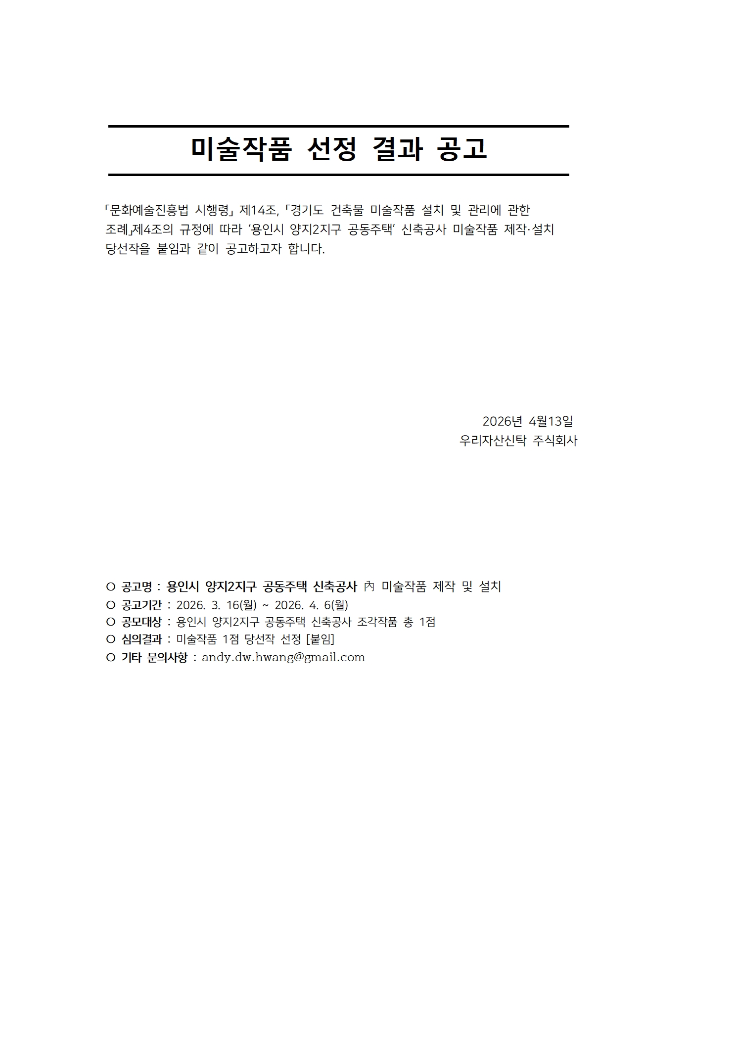 [공고안내] 용인시 양지2지구 공동주택 신축공사 內 미술작품 제작 및 설치 선정 결과 공고